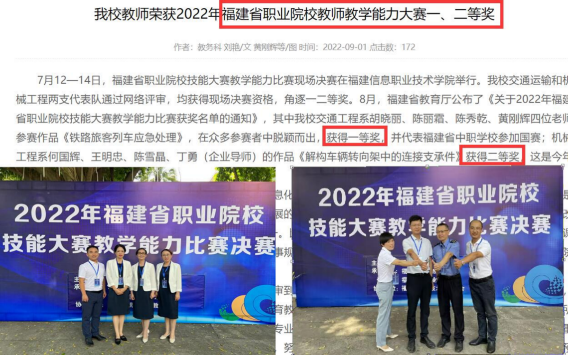 1.交通工程系党支部:胡晓丽、陈丽霜、陈秀乾、黄刚辉四位老师组成的团队获2022年职业院校技能大赛教学能力比赛省赛一等奖、国赛三等奖;谢芳、吴春巧等四位老师指导学生参加2022年一带一路暨金砖国家技能发展与技术创新大赛获城市轨道交通服务员技能赛项行车值班员福建赛区一等奖、全国总决赛二等奖;陈秀乾、胡晓丽两位老师撰写的论文分别获得2022年福建职业教育优秀论文一等奖;由黄刚辉主编,谢芳、刘艳老师参编的《铁路列车服务实务》教材入选“十三五”职业教育国家级规划教材、省级优质教材;胡晓丽、陈丽霜、肖菁、谢友奇、赵旭等参与省级精品课程《铁路运输设备》建设,并通过省教育厅验收;谢芳、吴春巧、陈秀乾等参与建设的省级精品课程《城市轨道交通运营安全》入选2022年度示范教学包。