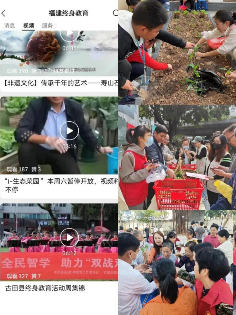 2022年6月-2023年10月,中心开设的“左海学堂”升级优化推出“人类幼崽成长日记”“家庭教育”“儿童哲学”“古典舞”系列课程4门,并结合“福建终身教育公共服务平台”小程序进行课程直播,观看直播人数达2418人次;“i-生态菜园”每周发布“绿蔬种植课”微课小视频,讲解绿蔬种植技巧,现已累计发布微课45个。其他地市社区教育机构也积极响应,推动社区教育辐射周边,如漳州市社区大学继续开设“丹霞讲坛”,邀请行业专家为老年朋友带来相关讲座;与漳州市图书馆共建、共享数字图书平台,为社区老年居民建立了环境舒适的数字社区书屋;举行“2022年全民终身学习活动周”系列活动——闽南方言文化研讨会。2022年11月30日和2023年9月29日,支部承办“福建省全民终身学习活动周”活动,通过多种形式积极联络群众,促进居民学习的参与性,开幕式采取云端在线直播方式,每次开幕式全省社区大学、老年大学、社区学院、社区学校(学习中心)及部分高校等设立分会场300多家分会场集中观看,两次开幕式累计50万多人次通过智能端在线观看直播。