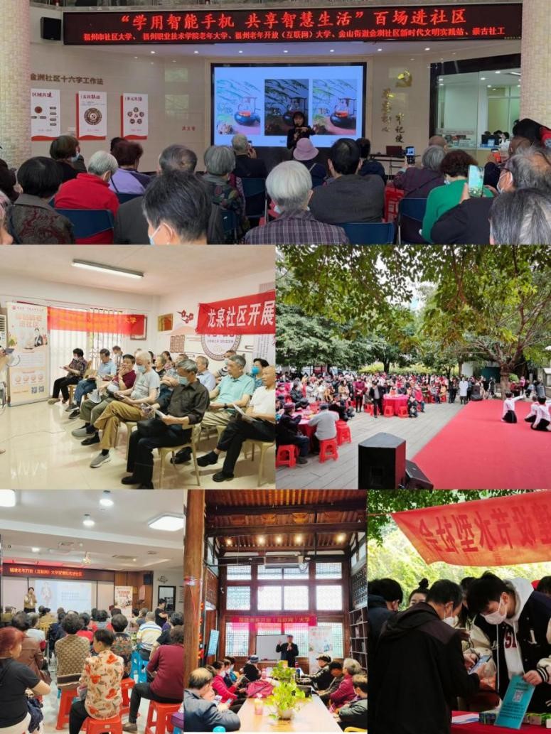 根据《福建老年开放(互联网)大学广泛开展老年人运用智能技术教育培训实施方案》的通知和《福建省老龄工作委员会办公室转发全国老龄工作委员会关于开展2022年全国“敬老月”活动的通知》,2022年6月-2023年11月,支部指导推动全体系组织实施工作,全省70家分校积极响应,百场“智慧助老”进社区专项培训活动已开展95场,线下参与学习人次近3500人。2022年12月,党支部“终身教育云课堂,智慧助力银龄学习”项目获“2020-2022学年福建省高校党支部工作‘立项活动’优秀成果”三等奖。2022年和2023年“敬老月”活动在全省范围内火热推进,如:支部携手金斗社区党委开展“重阳情浓暖人心 智慧助老进社区”活动,以集中式线下的服务带动线上的课程学习;宁德市社区大学邀请宁德市公安局刑侦支队副大队长倪守露开展“远离诈骗 智慧助老”专题讲座;屏南县古峰镇社区学校举办“老年人预防电信诈骗”知识讲座;漳州市老年开放(互联网)大学策划并打造国家级“智慧助老”教育培训项目——“智慧生活你我他”;宁德市老年开放(互联网)大学联合湖滨社区开展“智慧助老•情暖银发”专题讲座。支部积极参与“智慧助老”的培训和课程资源建设等工作,共分三批组织推介省级“智慧助老”优质工作案例53个、教育培训项目42个,课程资源98个。三批共获教育部推介53个,居全国第5名。