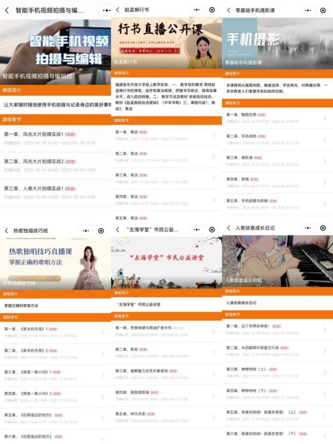 2022年6月-2023年10月福建老年开放(互联网)大学开设《摄影技术与艺术》《手机视频拍摄与剪辑》《智能手机应用》等系列课程6门20讲,漳州市老年开放(互联网)大学开发《银铃助老在行动 智慧生活你我他》系列课程9讲,在福建终身教育公共服务平台上进行线上直播并提供课程回放,目前累计直播观看达38623人次。福建终身教育公共服务平台老年教育版块持续更新展播优质课程,所展播的课程涵盖范围广、内容精、水平专,力争打造具有福建特色的线上微课网络阵地,让广大老年学员愿意学、学得会、用得上,促进资源课堂泛在可及。目前,福建终身教育网络学习平台总用户量已超过72万人、总访问量超过4612万次。